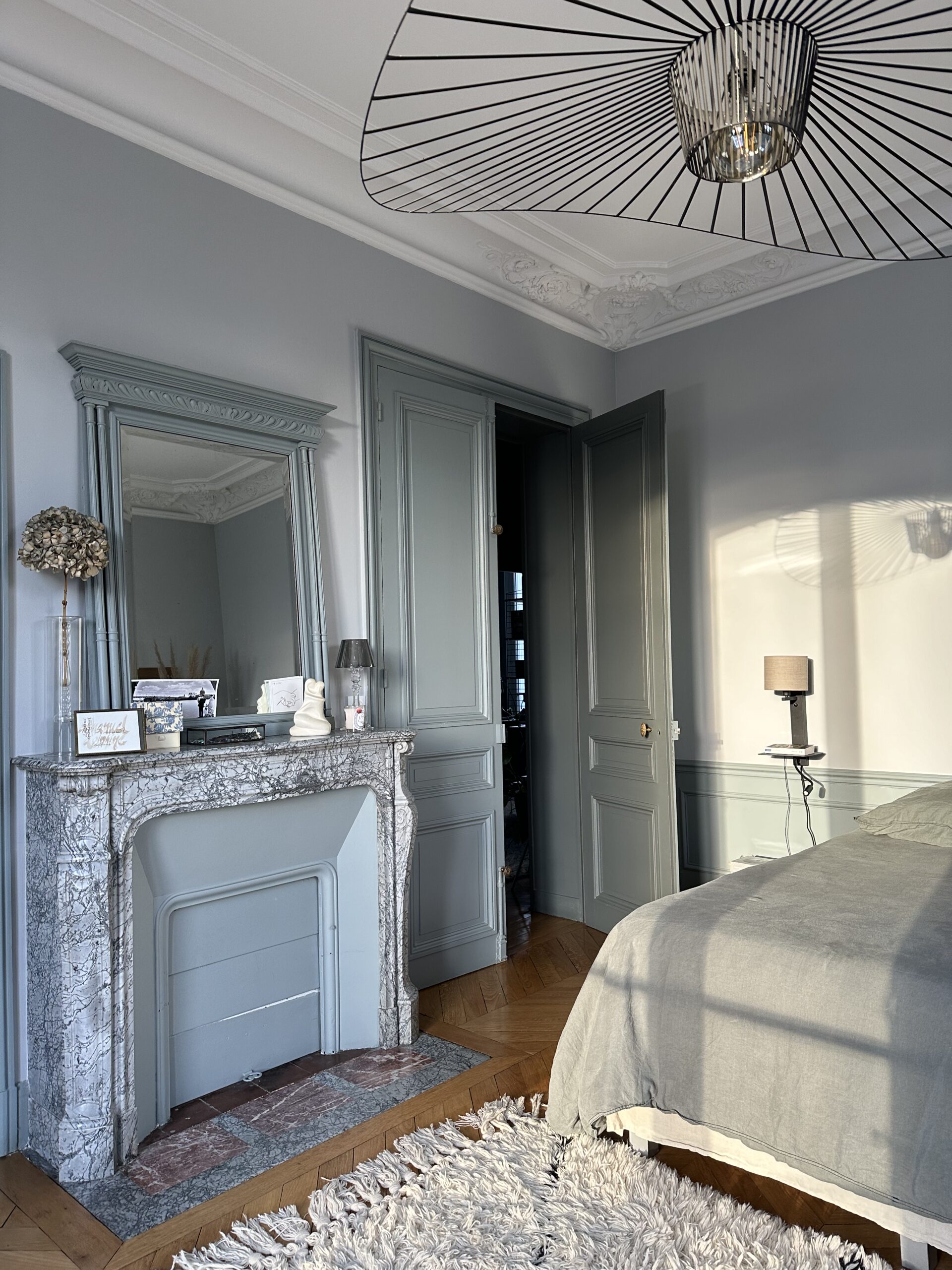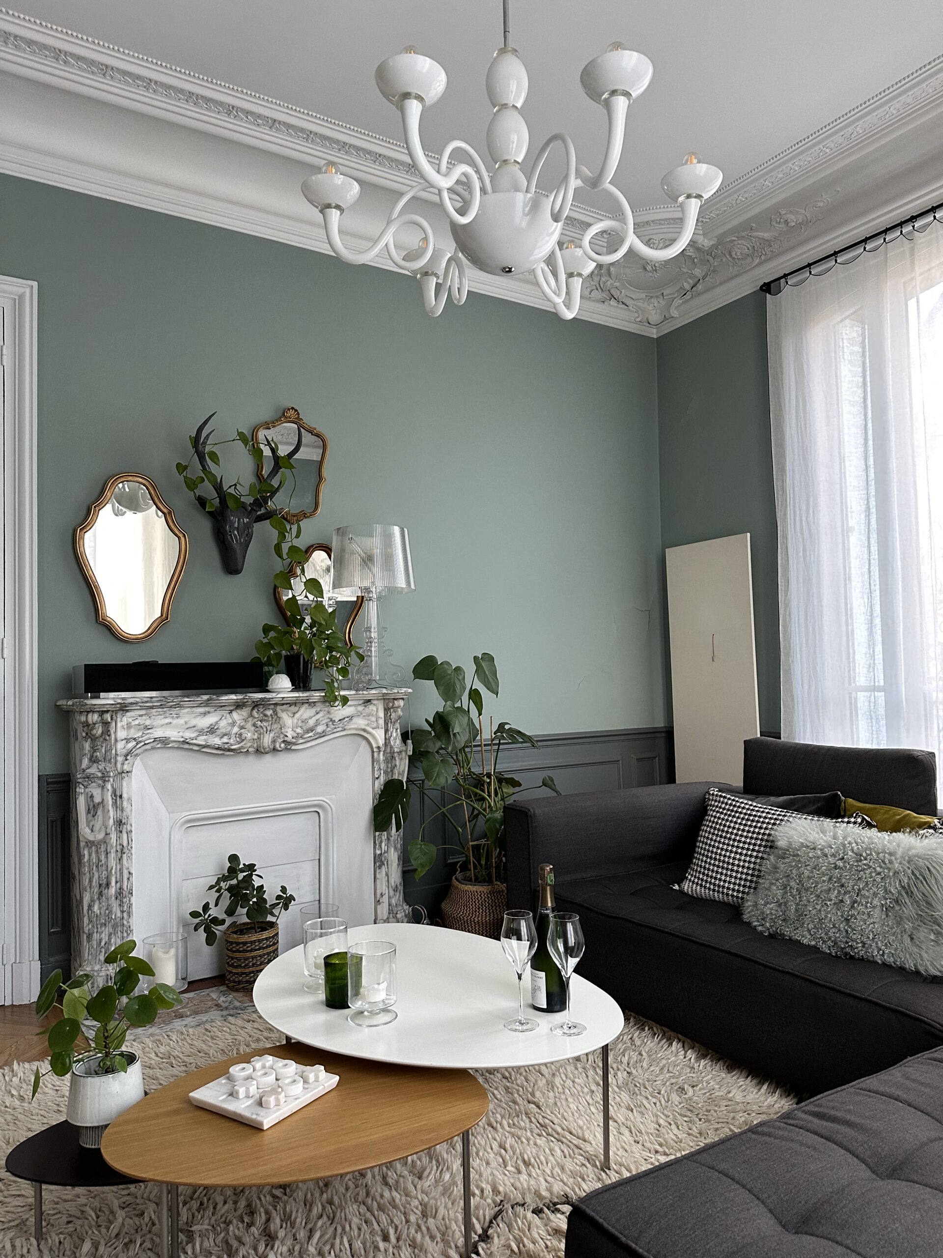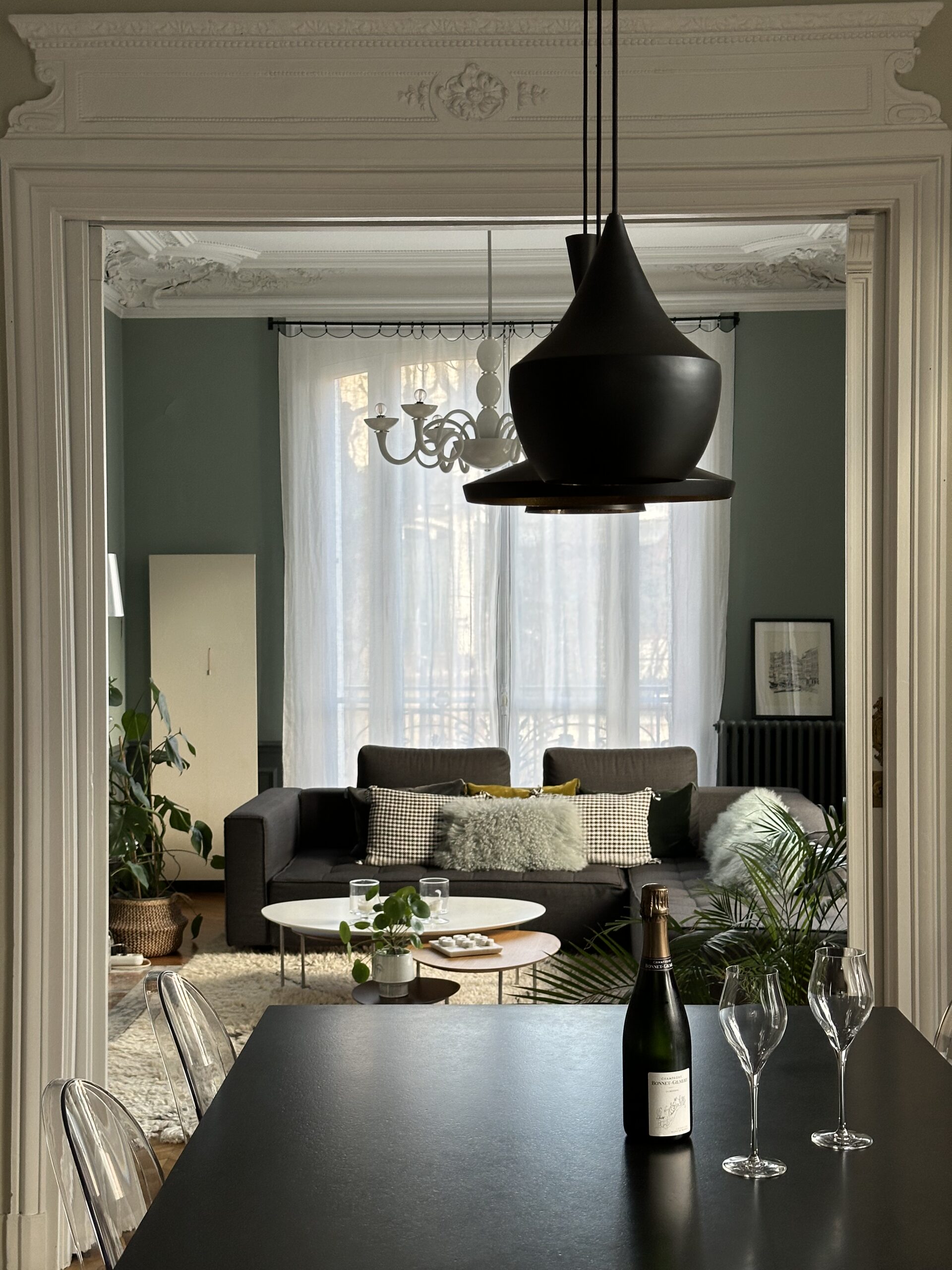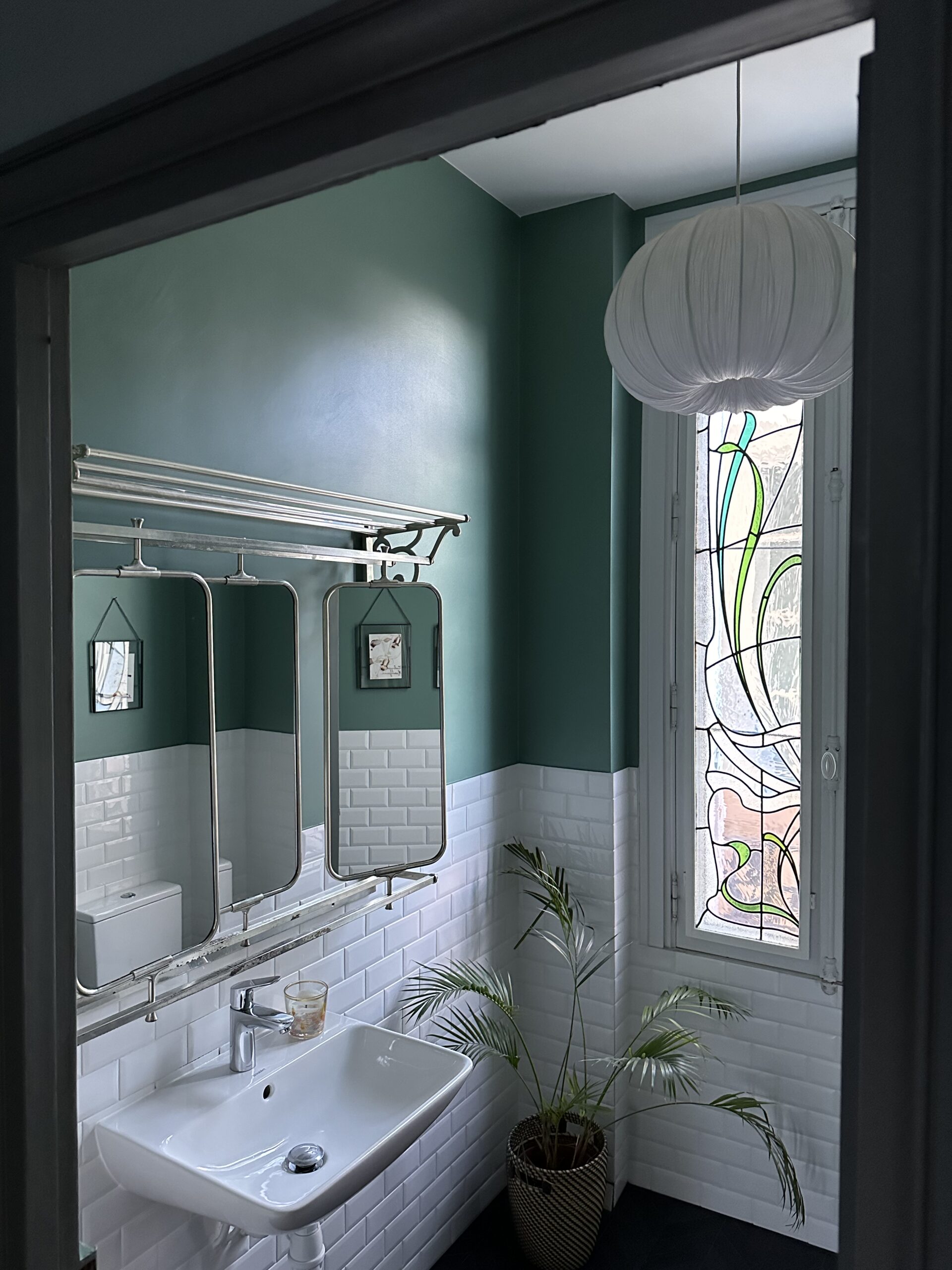 Une palette audacieuse de verts et de bleus rythme les pièces, alliant élégance, modernité et respect du patrimoine.
