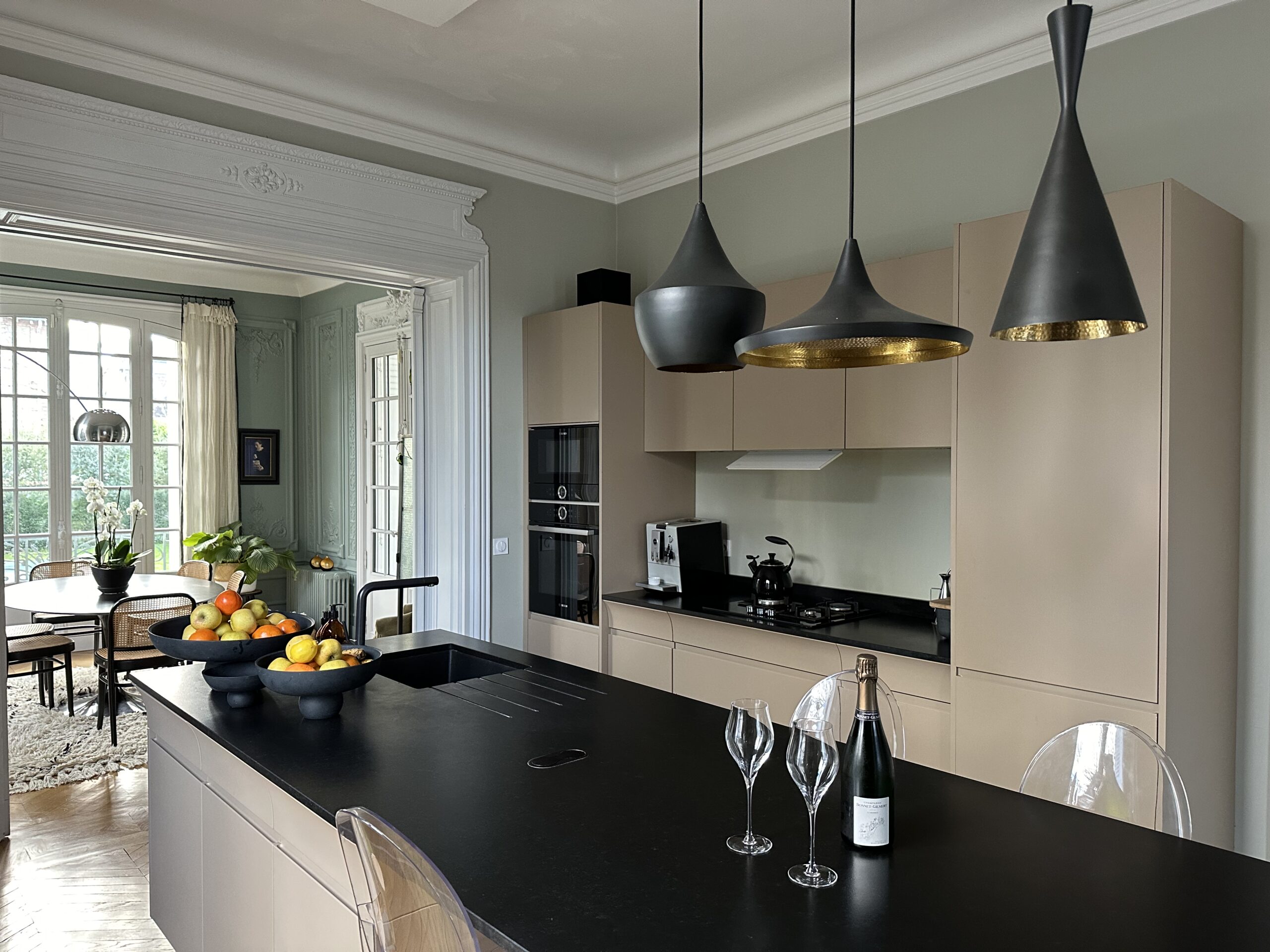 La redistribution des 300 m² a permis de créer un vaste espace de vie convivial, une suite parentale lumineuse, un univers enfant pensé sur mesure et une cuisine centrale, devenue le véritable cœur de la maison.